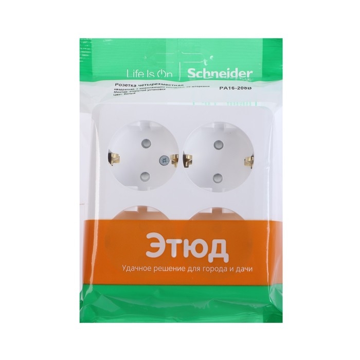 Розетка Schneider Electric "Этюд" с заземлением и шторками предназначена для применения в сетях до 250 В (~), с силой тока до 16 А. Четырёхместная розетка позволяет подключить четыре устройства в одном месте. Шторки обеспечивают дополнительную безопасность при косвенных прикосновениях.