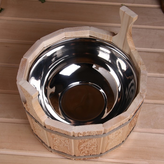 Шайка-таз из липы, 5 л, двуручная,нержавеющая вставка, Русский узор