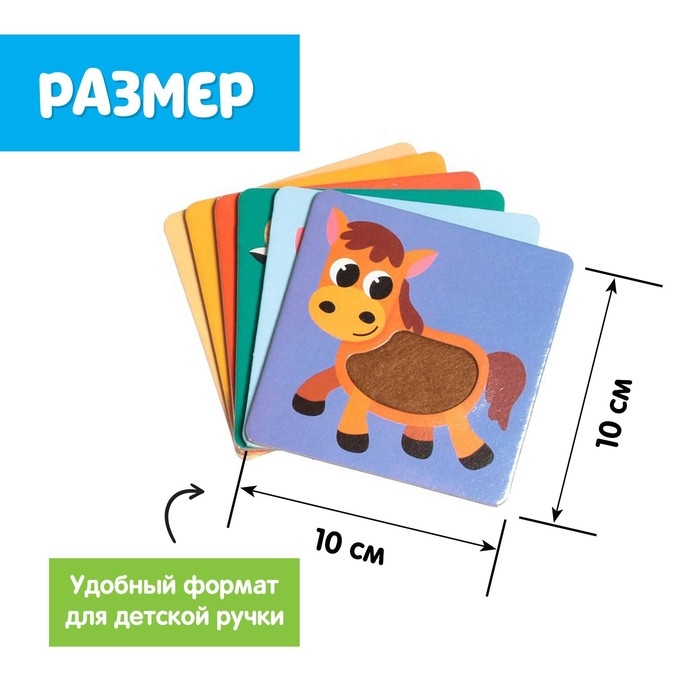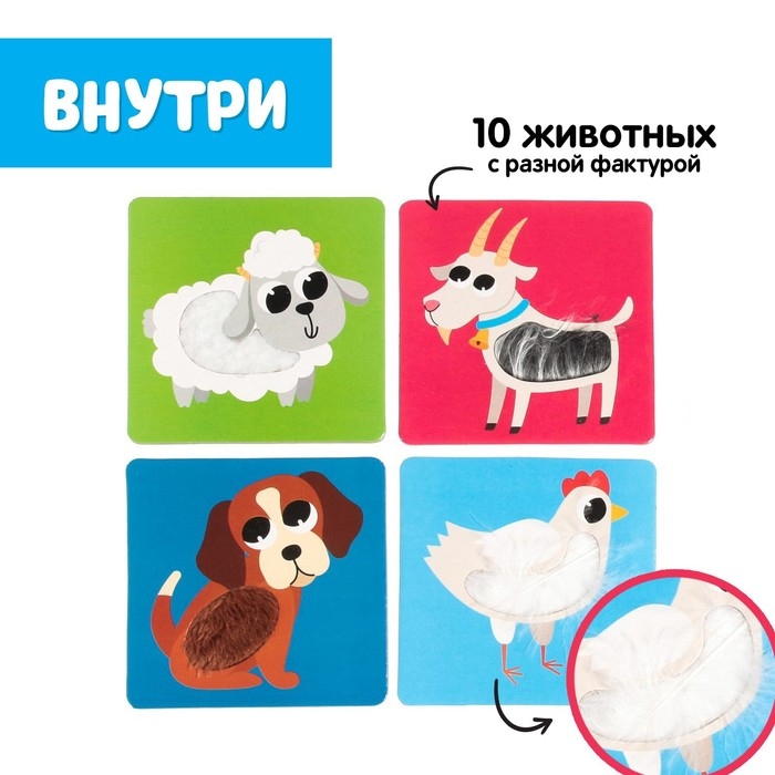В развивающем наборе «Животные фермы» есть множество тактильных элементов на карточках с животными. Они представлены вкладками, соответствующими поверхности тела каждого зверька.