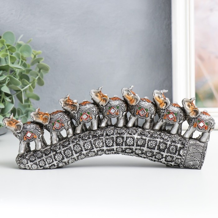 Сувенир полистоун "Семь слонов на бивне с цветами" серебро 21х4х9,8 см
