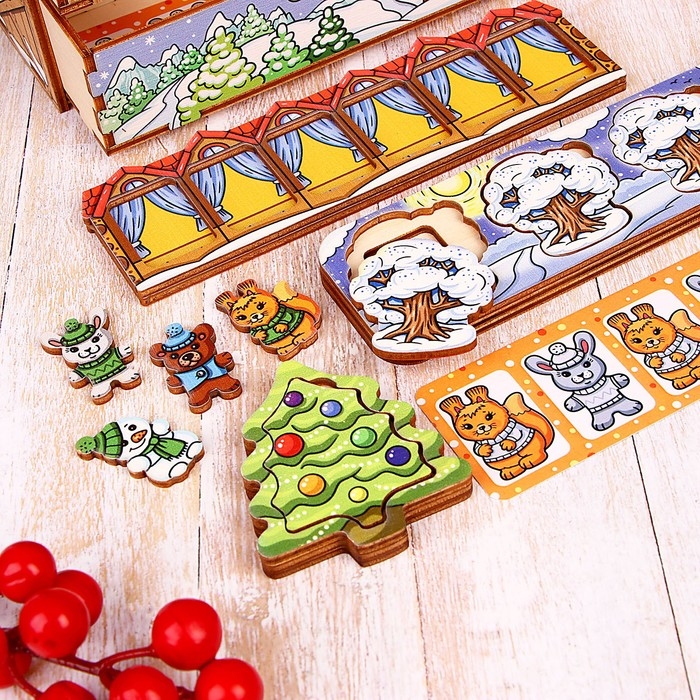 - Игра «Зимние прятки». Возьмите 4 фигурки персонажей, попросите ребёнка разместить их в рамке-вкладыше «Зимний лес» и запомнить их расположение. После того, как ребёнок закроет всех персонажей фигурками деревьев, попросите вспомнить, кто спрятался за первым деревом, последним деревом?