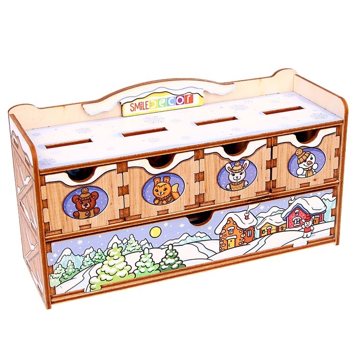 - Игра «Сортировка». Предварительно вставьте верхние выдвижные ящички в комодик, повернув их стороной с изображением персонажей к ребёнку. Предложите разместить зверят и снеговиков в соответствующие ящички, опуская фигурки по одной в прорези сверху.