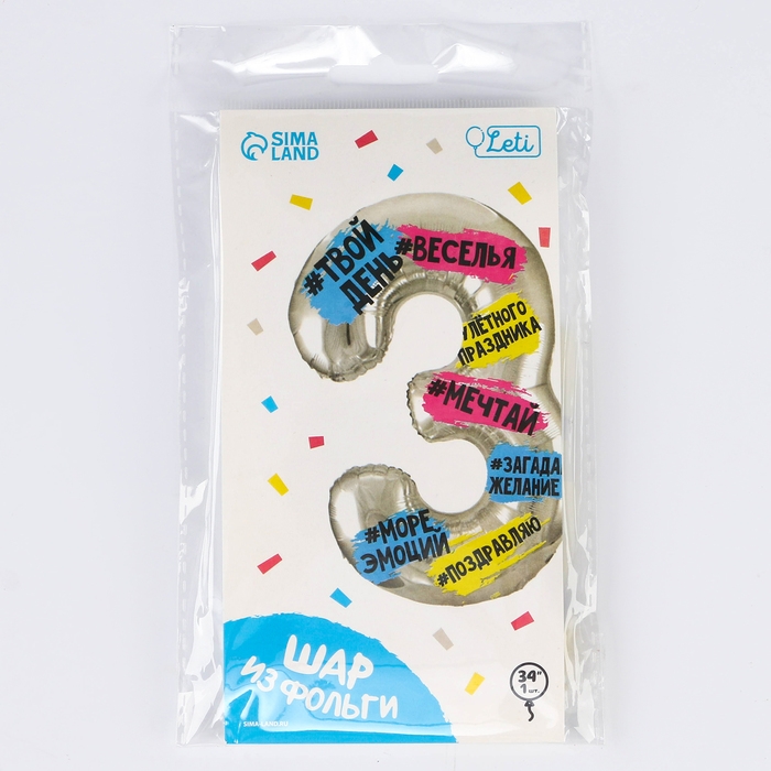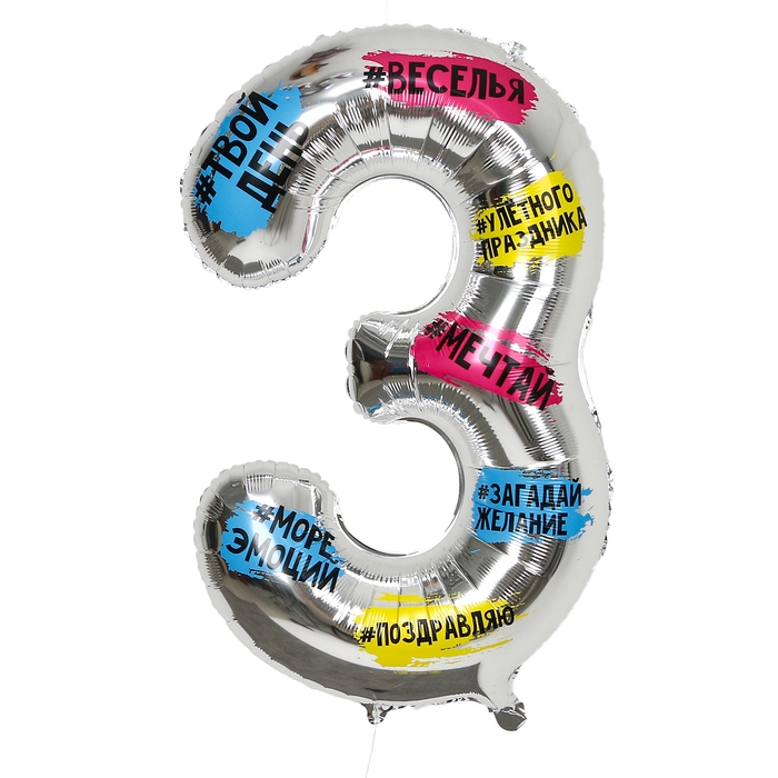 Воздушный шар фольгированный 34" Цифра 3, хештеги, с подложкой
