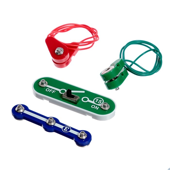 - В электронном конструкторе необходимо использовать батарейки 1,5 В. Такое напряжение безопасно для человека. Поэтому ребёнок сможет самостоятельно играть с набором, а вы — не переживать о его безопасности.