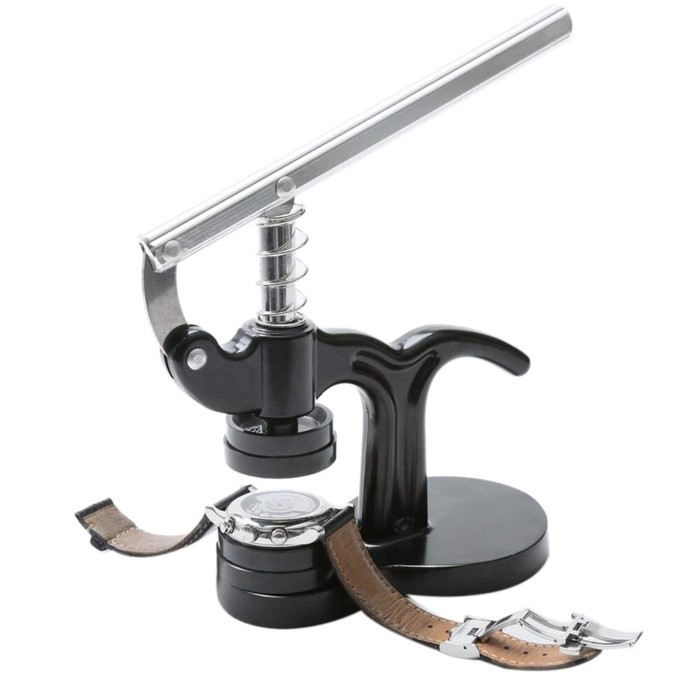 Пресс для замены задней крышки часов. В комплекте 12 винтовых фторопластовых насадок разного размера (18 - 50 мм), что позволяет использовать пресс с часами любого размера и формы.