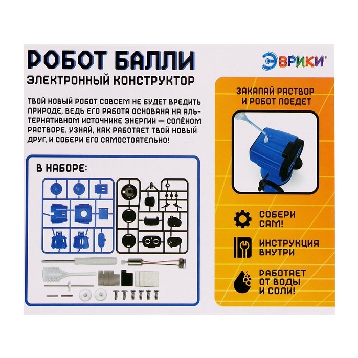 С электронным конструктором юный инженер соберёт робота «Балли» Собранная модель работает от воды солью — ребёнок научится смешивать лёгкий электролит.