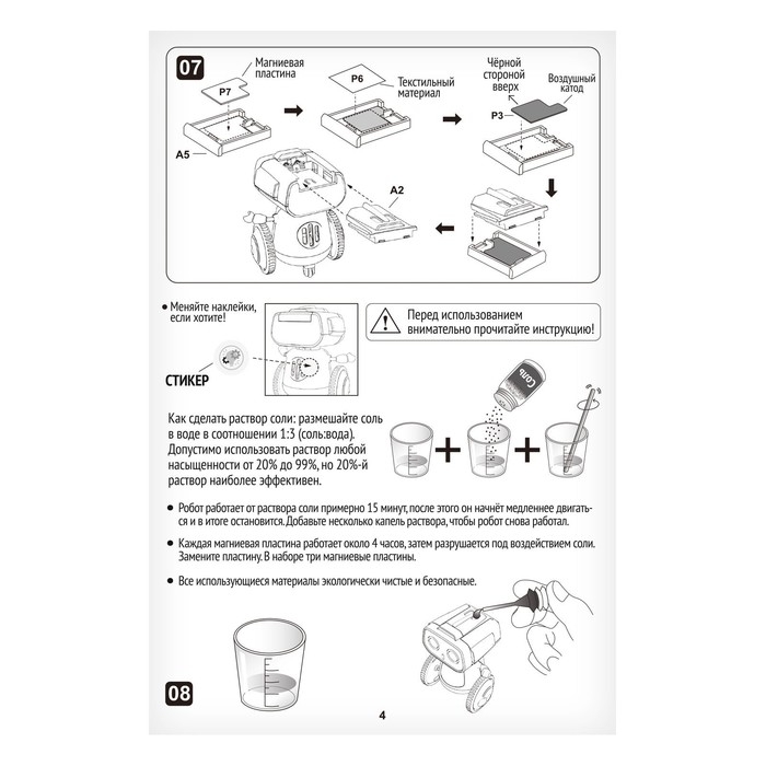 Обратите внимание! Робот работает от раствора соли примерно 15 минут. После этого он начнёт медленнее двигаться и в итоге остановится. Добавьте несколько капель раствора чтобы робот снова работал.