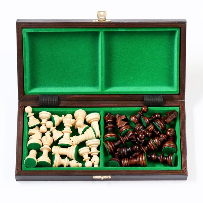 Наличие бархата зеленого цвета добавляет изыска изделию, а для удобного хранения шахматных фигур предусмотрены специальные отсеки, что обусловливает минимум передвижения при переноске.