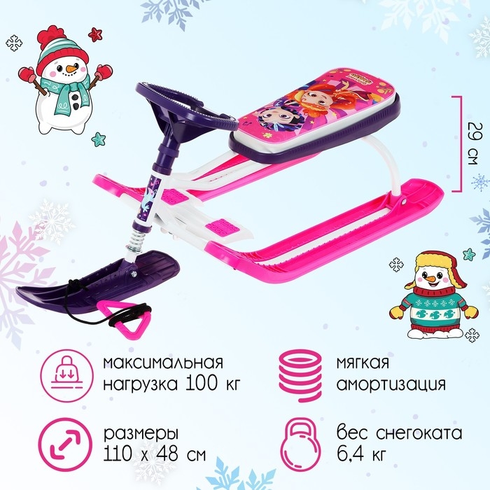 Снегокат предназначен для перевозки детей по плотному снегу или льду, катанию с горок. Имеет сварную конструкцию из стальных труб и пластиковых элементов. Оснащён мягким сиденьем, обтянутым искусственной кожей с рисунком. Оборудован буксировочным тросом и системой амортизации, которая обеспечивает комфортную поездку по крутым горкам и неровным поверхностям. Усиленный тормоз эффективен на обледенелой поверхности. В комплект входит набор наклеек на снегокат.
