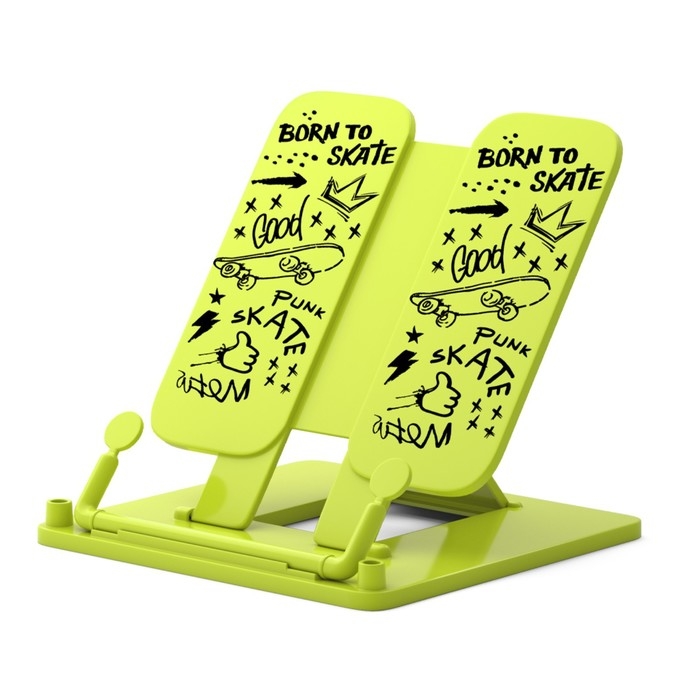 Складная подставка с фиксатором для книг. Рисунок нанесен тампопечатью. Позволяет расположить книгу под удобным углом наклона (7 углов). Держатель, расположенный в нижней части, надежно фиксирует страницы. Ширина подставки — 235 мм, высота спинки — 190 мм.