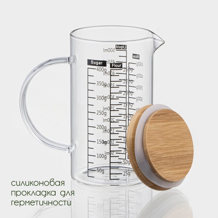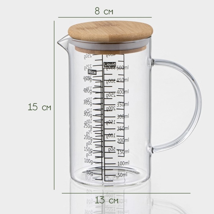 Кувшин для воды стеклянный мерный с бамбуковой крышкой BellaTenero «Эко», 500 мл, 13×8×15 см