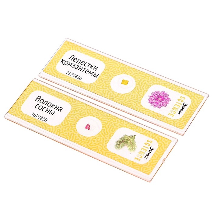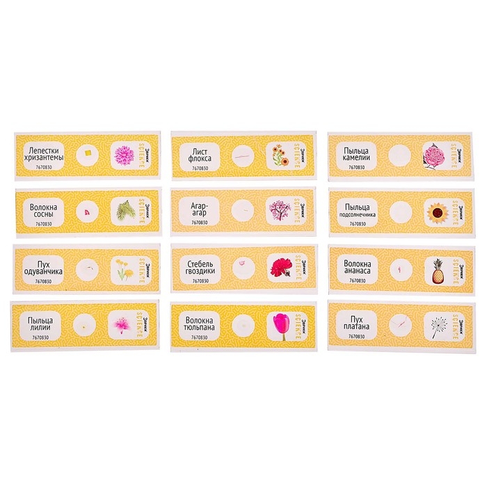 Наборы микропрепаратов делятся на серии, доступны следующие темы для изучения: цветы, животные, растения, насекомые.