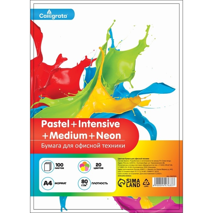 Бумага цветная А4 100л Calligrata Пастель + интенсив + неон + умеренный МИКС 20цв 80г/м2