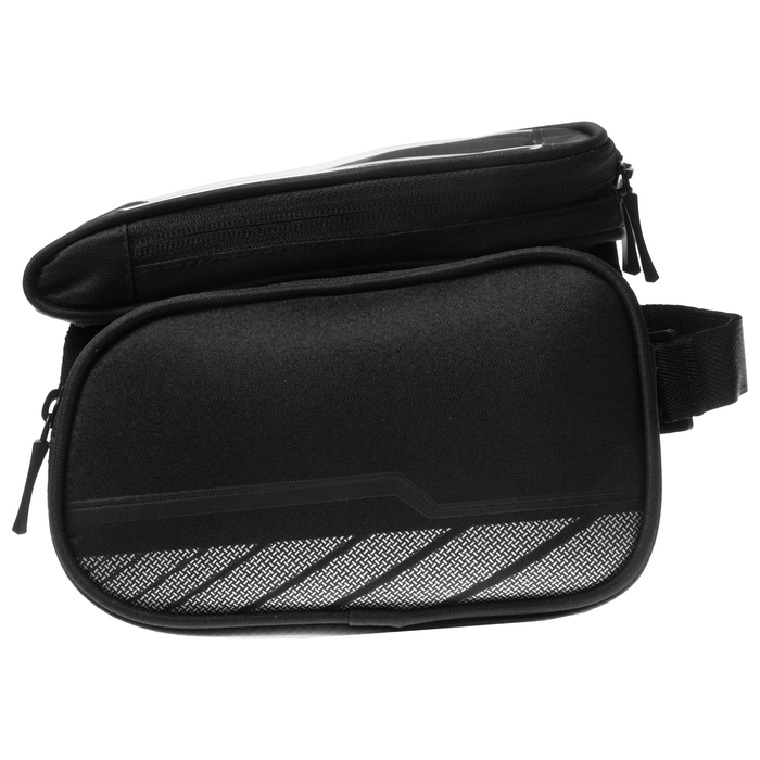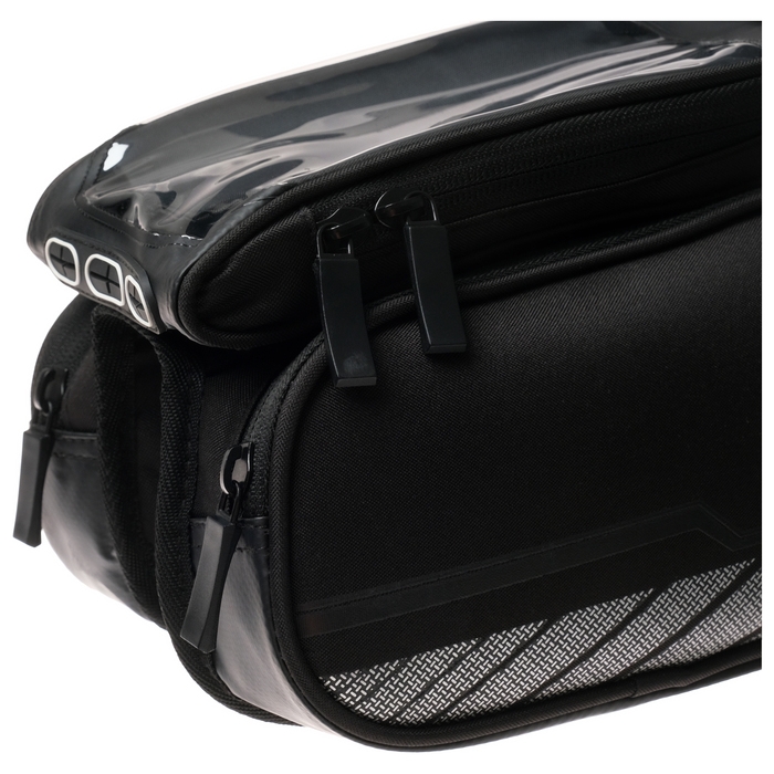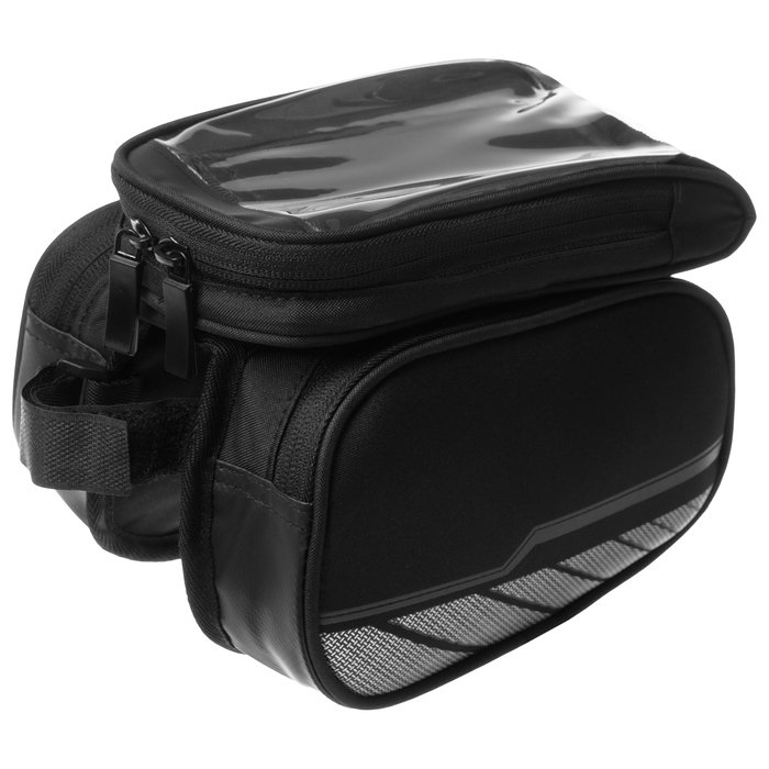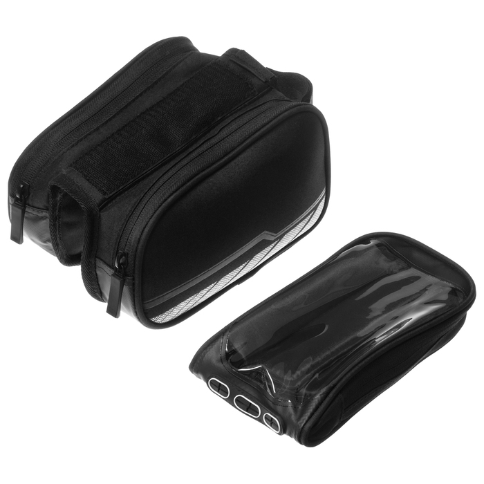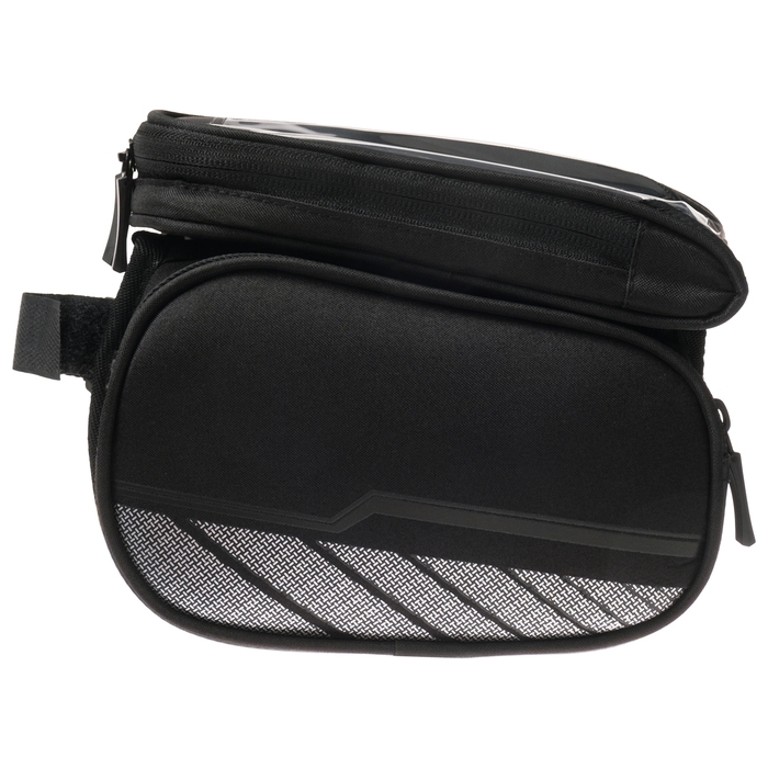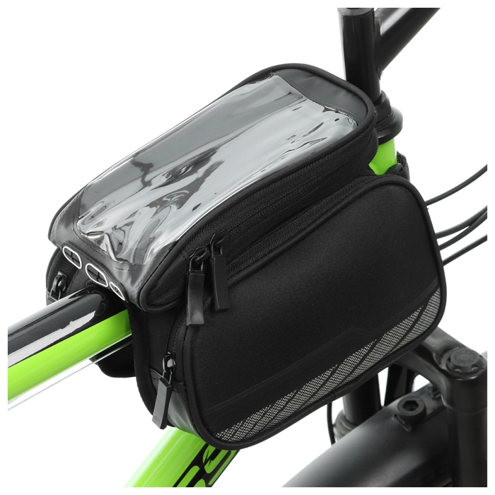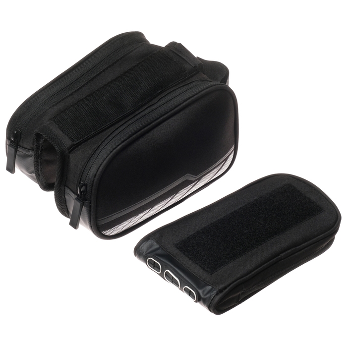 Велосумка крепиться на раму велосипеда. Имеет один отсек на молнии и дополнительный отсек под телефон с прозрачной крышкой.