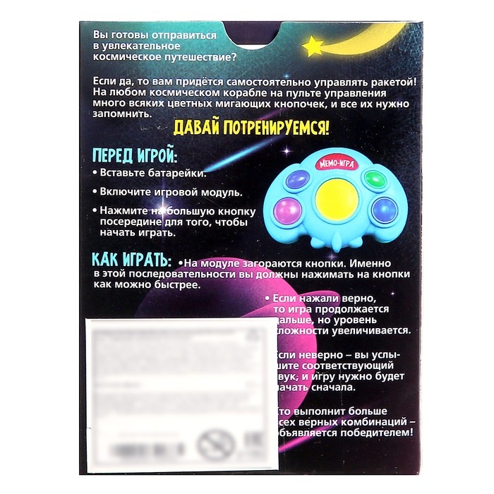 Настольная игра «Нажимай-запоминай. В космосе» рекомендована для детей от 3 лет. Рассчитана на 1 игрока.