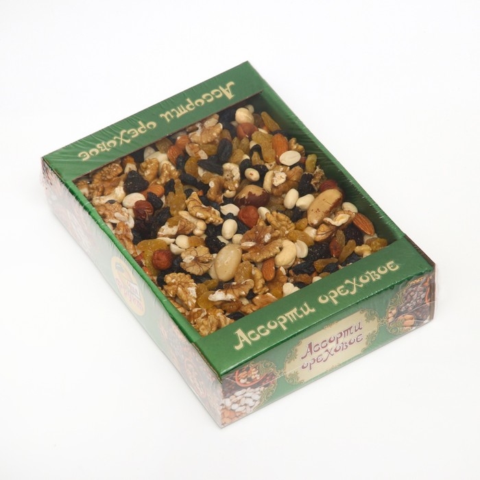 Состав: изюм Джамбо золотой, изюм Джамбо черный, кешью сырой, ядро миндаля, ядро грецкого ореха, ядро фундука, арахис бланшированный, ядро абрикосовых косточек, ядро бразильского ореха.
