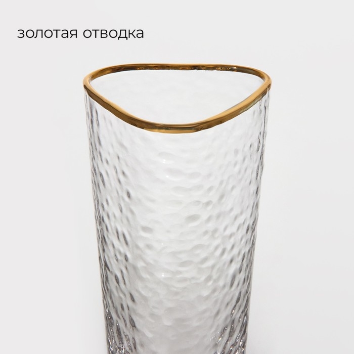 Форма бокала — треугольник, а золотая отводка по краю добавляет элегантности и роскоши. Бокал удобен в использовании, прочен и долговечен, а также доступен по цене.