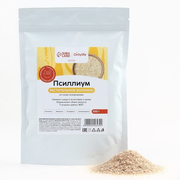 Onlylife Псиллиум из семян подорожника, источник клетчатки, снижение сахара и холестерина, нормализует обмен веществ, 200 г.