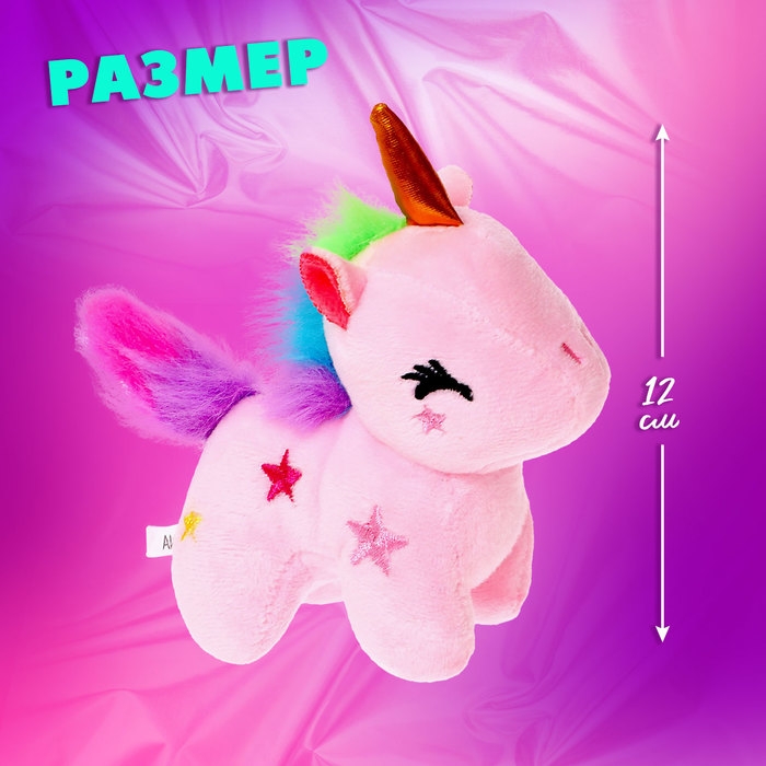 - Мягкая игрушка — единорог высотой 12 см. Питомец очень компактный, поэтому его удобно захватить с собой на прогулку, в гости и даже в путешествие!