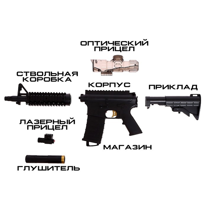 - M4 можно разобрать на части: глушитель, упор, лазерный прицел, корпус с магазином, оптический прицел (имитация), приклад.