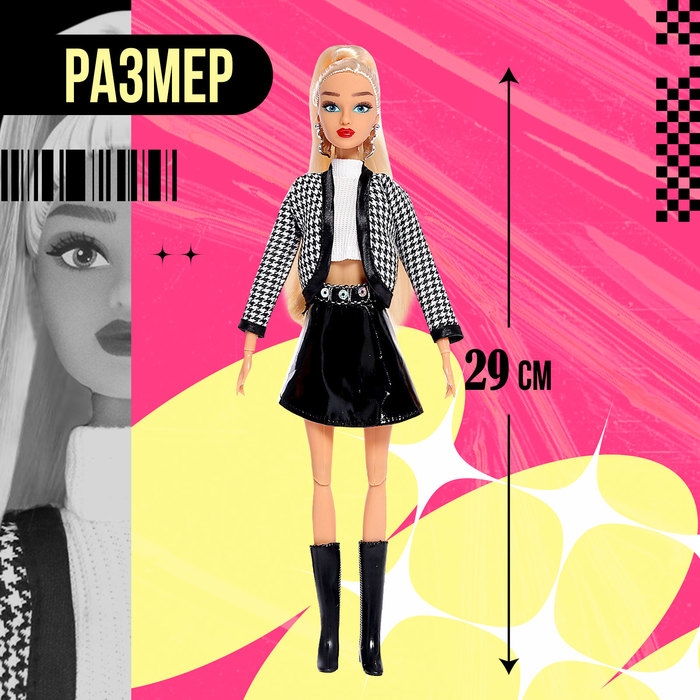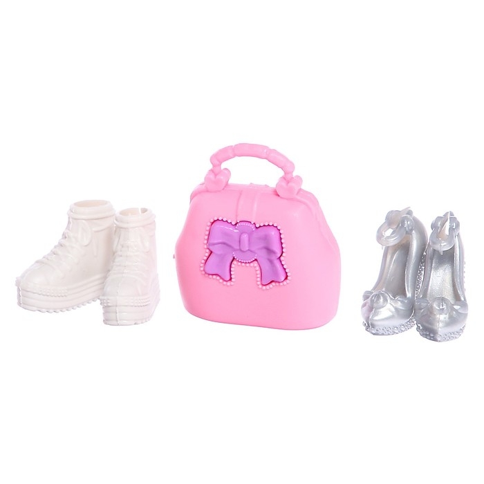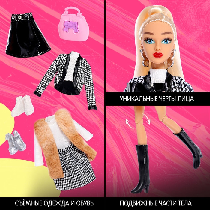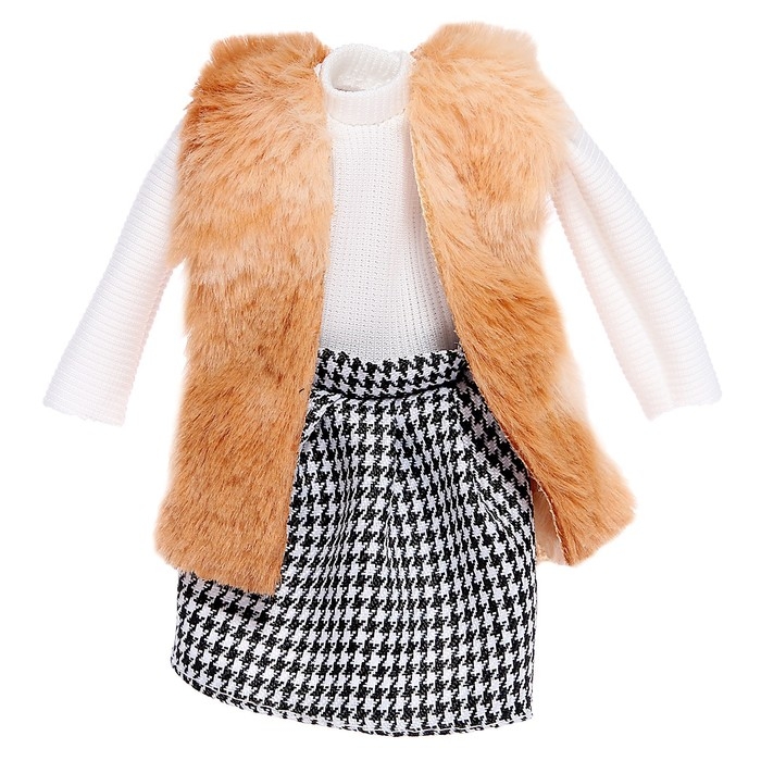 - В комплект входит одежда для создания разных образов: 3 пары обуви, сумка, кофта, юбка, меховая жилетка, укороченный кардиган.