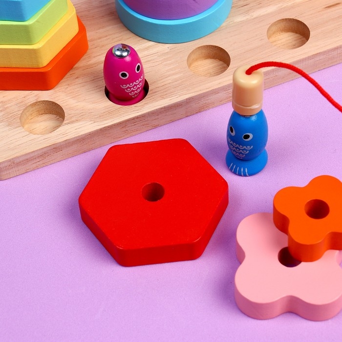 - Задача малыша — правильно подобрать детали по цветам или форме и надеть их на столбики. Также на игровом поле есть выемки для магнитных рыбок.
