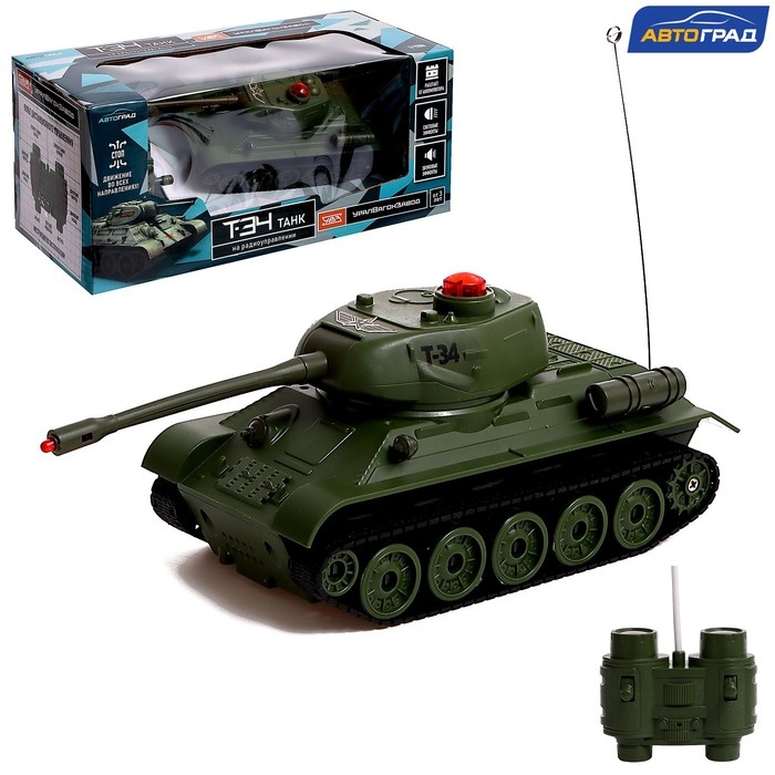 Танк радиоуправляемый Т34, работает от аккумулятора, свет и звук, цвет зелёный