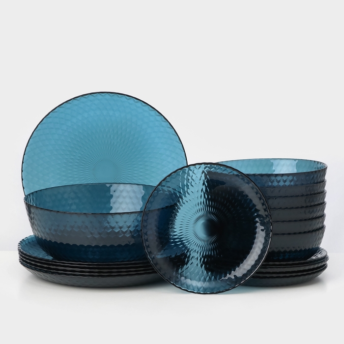 Набор столовый стеклянный «Идиллия», 19 предметов: 6 тарелок d=25 см, 6 тарелок d=19 см, 6 тарелок d=18 см, салатник d=23 см, цвет лондон топаз