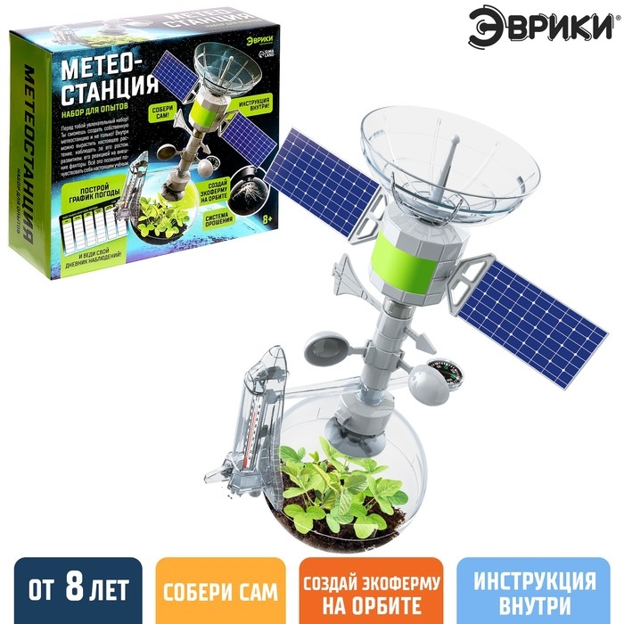 Набор для опытов «Метеостанция» позволит ребёнку самостоятельно собрать измерительный прибор, понаблюдать за погодой и вырастить настоящее растение. Набор познакомит юного учёного с метеорологией и поможет понять, насколько важно следить за экологией.
