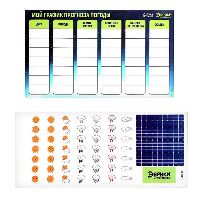- Набор включает график погоды и дневник наблюдений — брошюру, в которую ребёнок сможет записывать свои наблюдения за погодой.