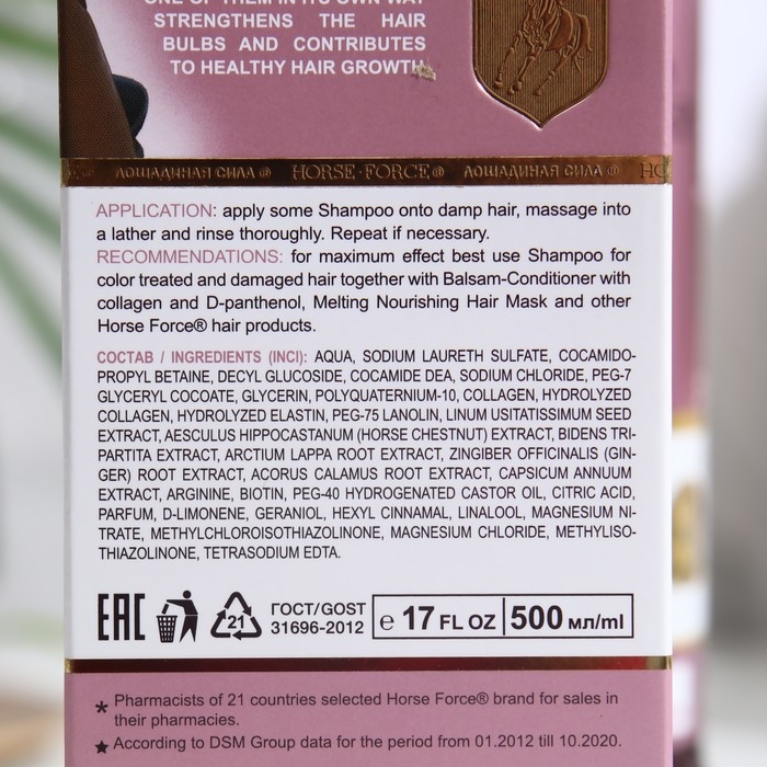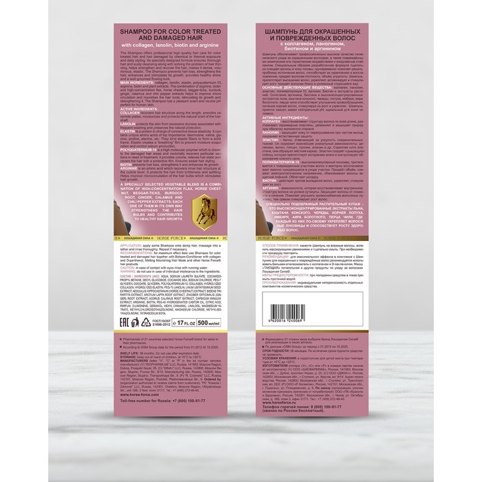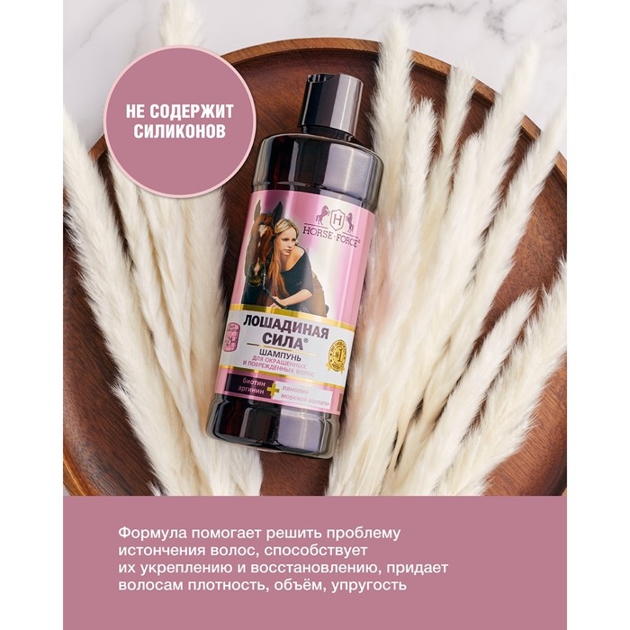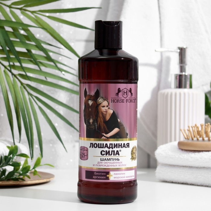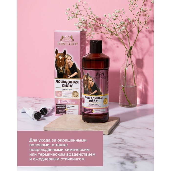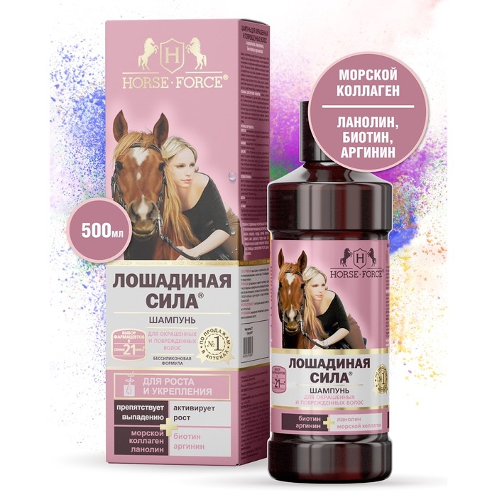 Шампунь Лошадиная сила для окрашенных и поврежденных волос с коллагеном иланолином, биотином, 500 мл