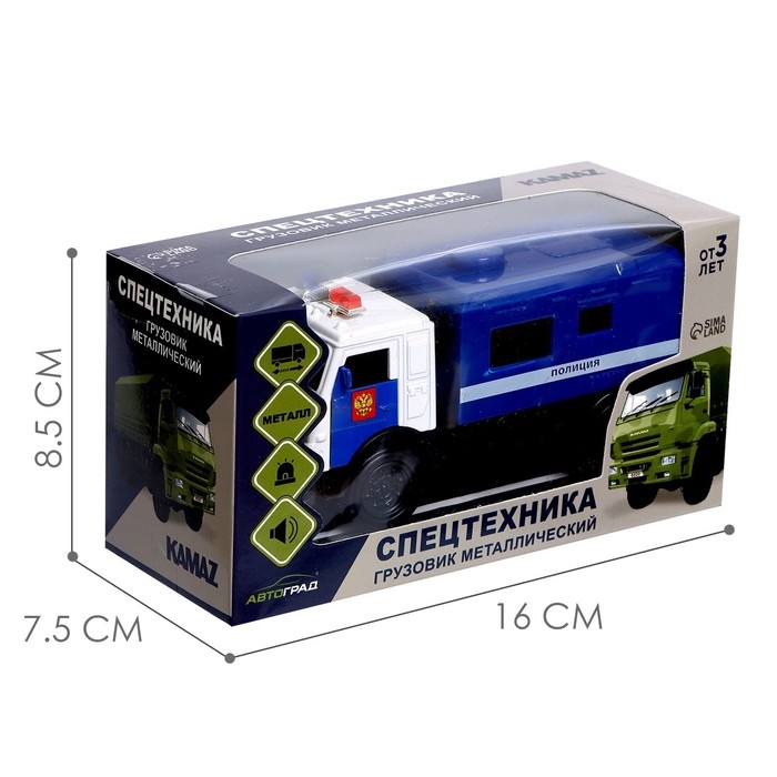 Лицензионная модель КамАЗ «Автоград» — детально проработанный транспорт спецслужб. Машинка дополнит игрушечный автопарк и станет прекрасным подарком для маленького любителя техники.