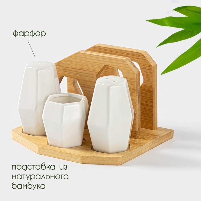 Набор для специй на деревянной подставке BellaTenero, 4 предмета: солонка 75 мл, перечница 75 мл, салфетница, ёмкость для зубочисток, цвет белый
