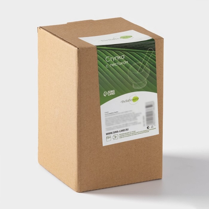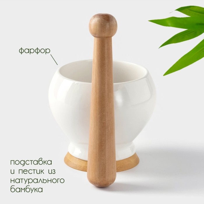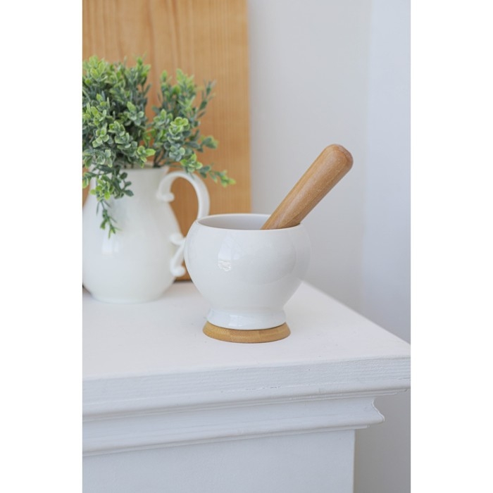 Ступка фарфоровая для специй с пестиком на бамбуковой подставке BellaTenero, 380 мл, цвет белый