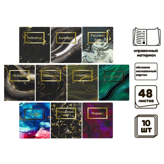 Комплект предметных тетрадей 48 листов 10 предметов "Мрамор темный", со справочным материалом, обложка тетрадей имеет покрытие софт-тач с тиснением золотой фольгой. Дизайн обязательно понравится ценителям современных молодёжных трендов.