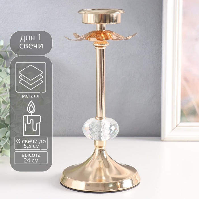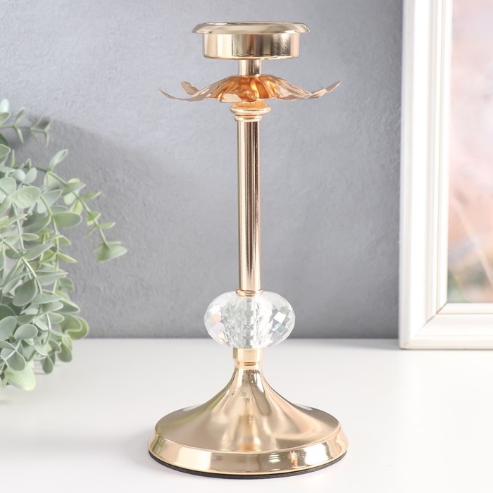 Подсвечник металл, стекло на 1 свечу "Ножка цветка" d-5,5 см золото с хрустал. 11х11х24 см