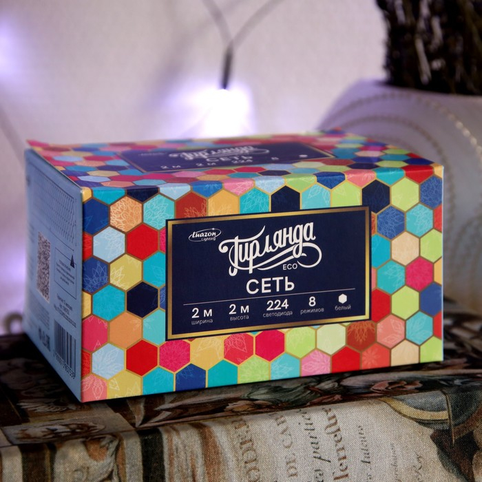 Гирлянда «Сеть» 2 × 2 м, IP20, тёмная нить, 224 LED, свечение белое, 8 режимов, 220 В