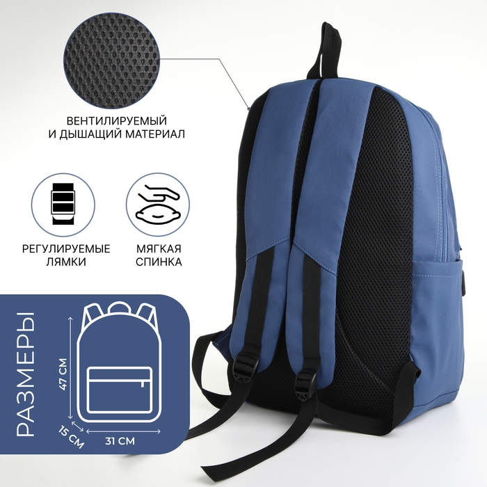 Рюкзак школьный из текстиля на молнии, 2 отдела, 3 кармана, цвет синий