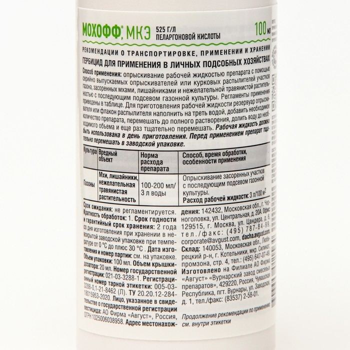 Биопрепарат "Мохофф" легко справляется с такими проблемами как мхи, лишайники и нежелательной травянистой растительностью на газонах, садовых дорожках, отмостках, швах плитки и т.д. Препарат полностью уничтожает растительность, на которую он попадает, поэтому при удалении мха с газона следует обрабатывать контактно по уже пораженным участкам и впоследствии подсевать газон на этих местах