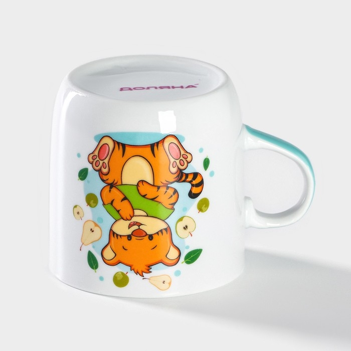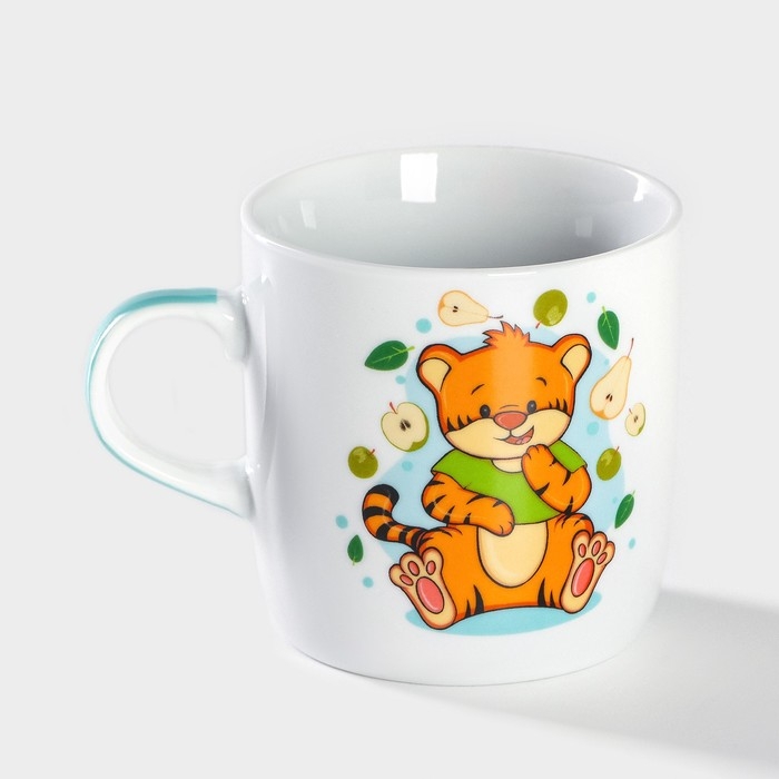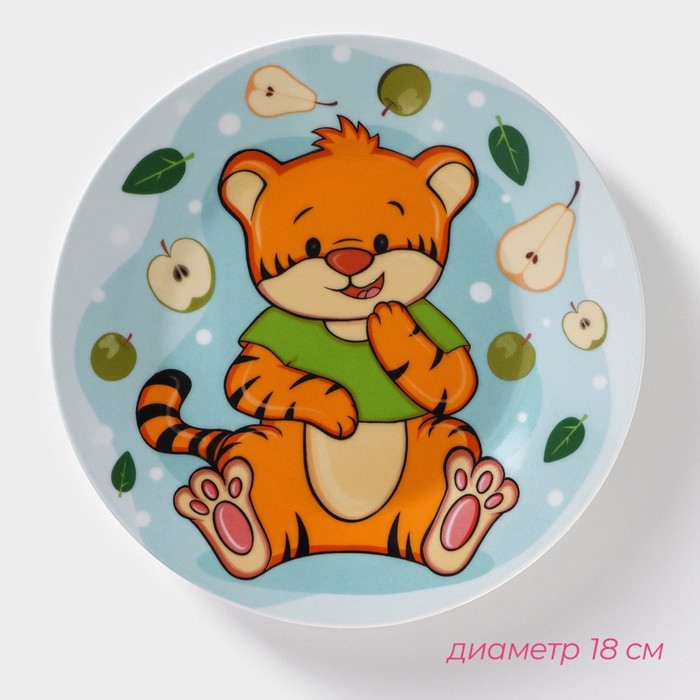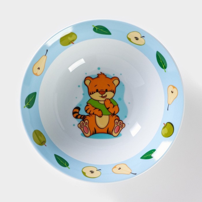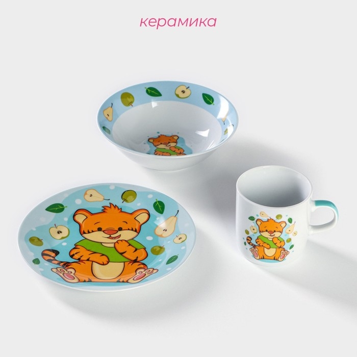 Набор детской посуды из керамики Доляна «Тигрёнок с грушами», 3 предмета: кружка 230 мл, миска 400 мл, тарелка d=18 см, цвет белый