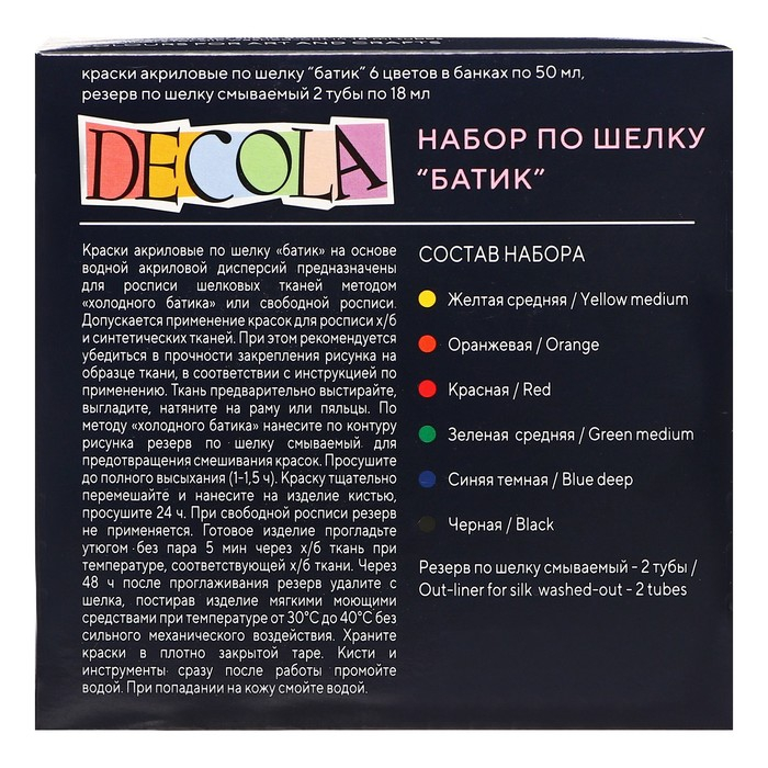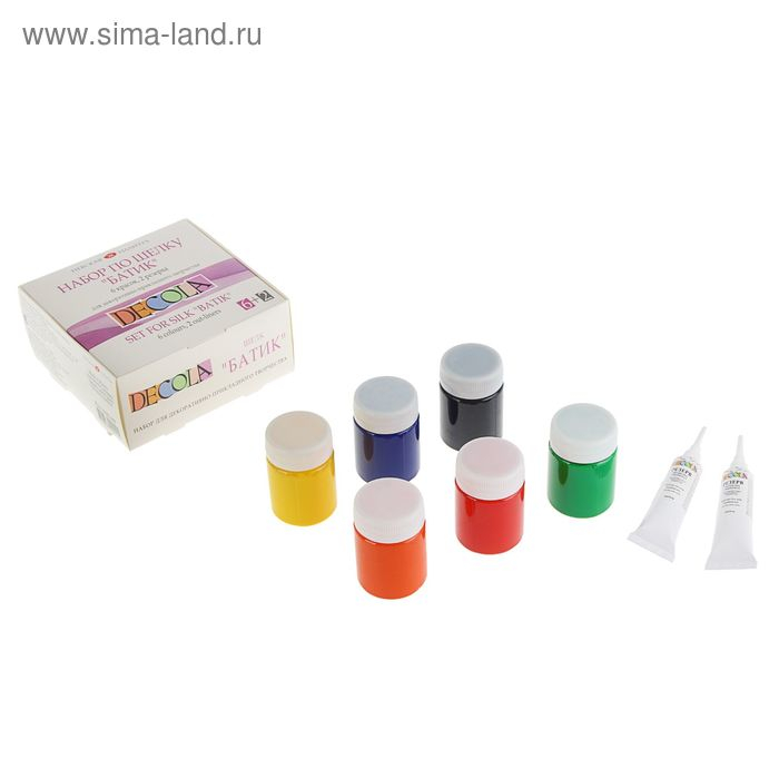 Краска по ткани (шелку), набор 6 цветов х 50 мл, ЗХК Decola "Батик" (резерв 2 штуки х 18 мл), акриловая на водной основе, (4441448)