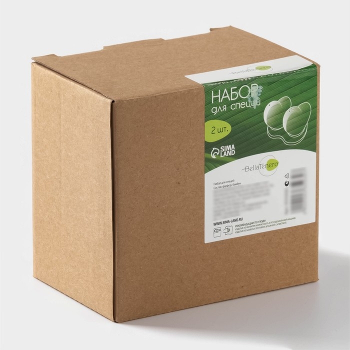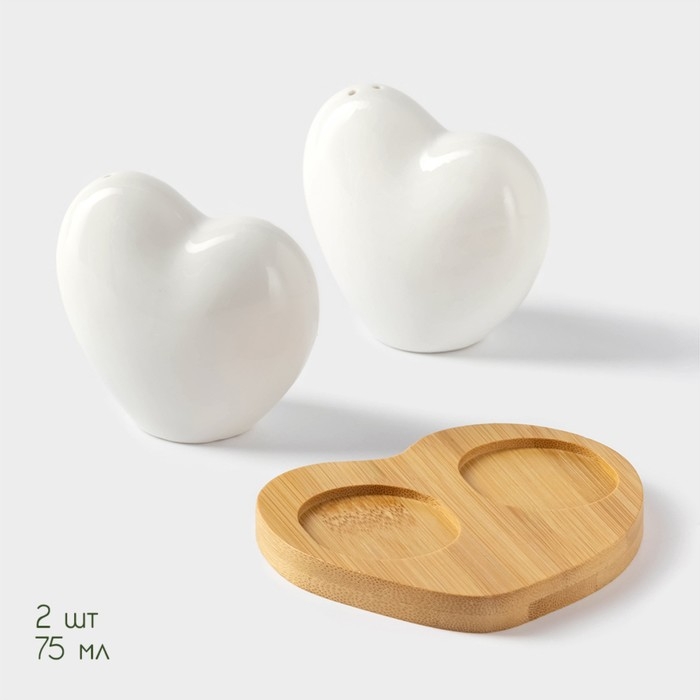 Набор фарфоровый для специй на бамбуковой подставке BellaTenero «Тепло сердец», 2 предмета: солонка 75 мл, перечница 75 мл, цвет белый