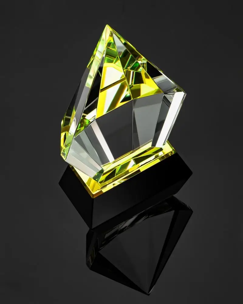 Стела изготовлена из стекла К9, в основе которого лежит оптическое боросиликатное стекло. Эту марку стекла отличает низкий процент посторонних включений, высокий показатель преломления и высокая прозрачность — идеальные качества для изготовления наград премиального уровня.