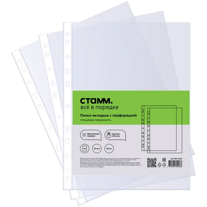 Файл-вкладыш А4, 40 мкм, Стамм, глянцевый, вертикальный, 100 штук