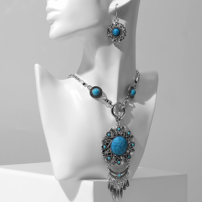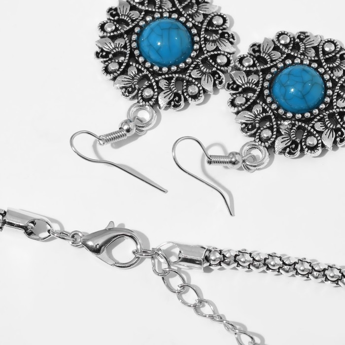 Набор 2 предмета: серьги, колье «Индия», цвет голубой в чернёном серебре, 32см