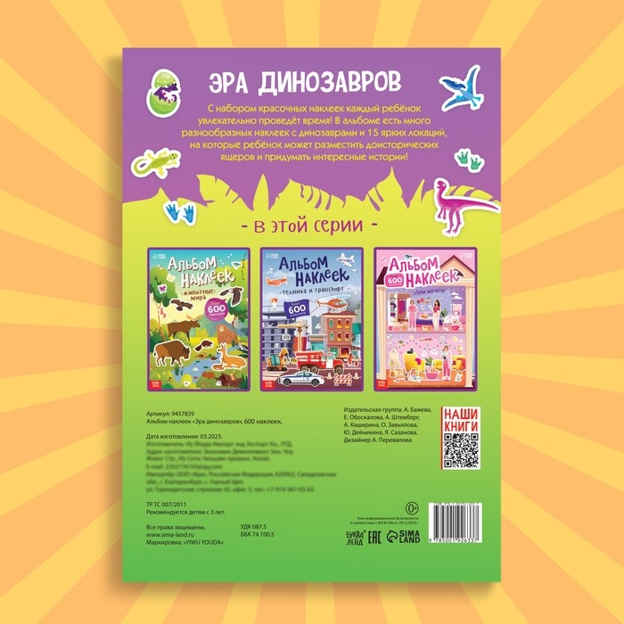 С этим альбомом каждый ребёнок увлекательно проведёт время! Внутри вы найдёте множество красочных наклеек с разными видами динозавров, а также 15 локаций для их размещения.