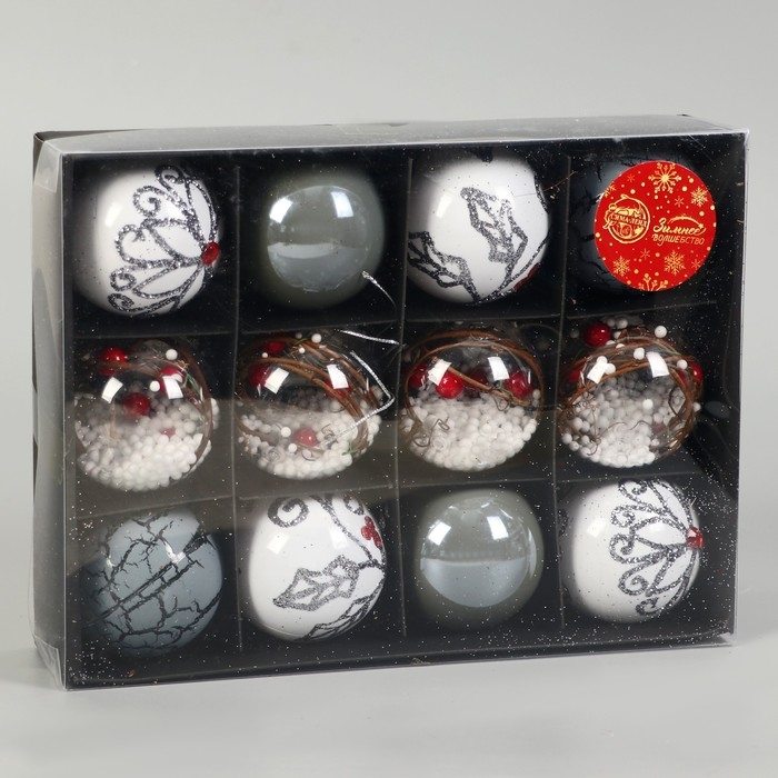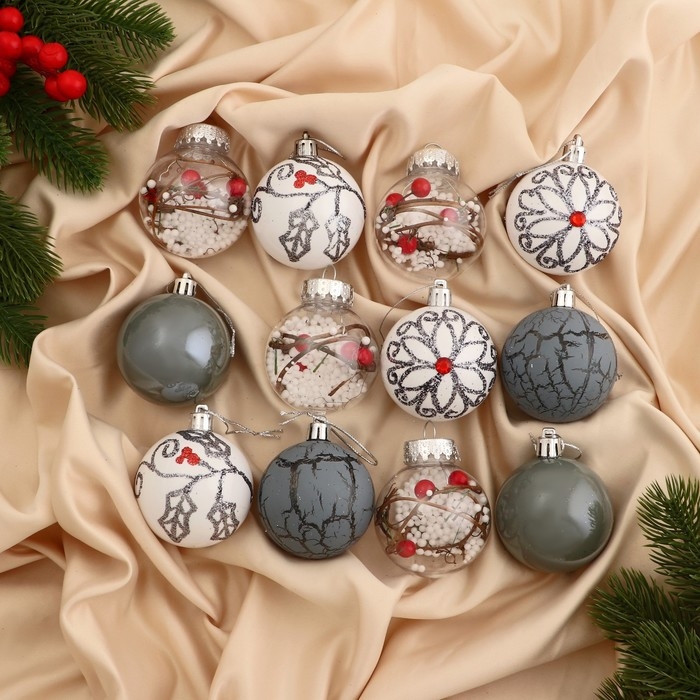 Набор шаров пластик d-6 см, 12 шт "Мелодия элит" ассорти, белый серый