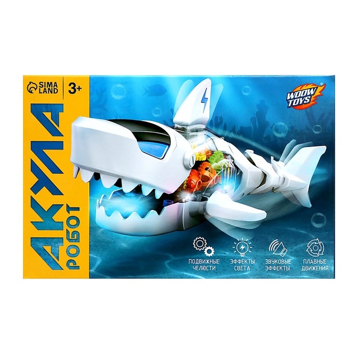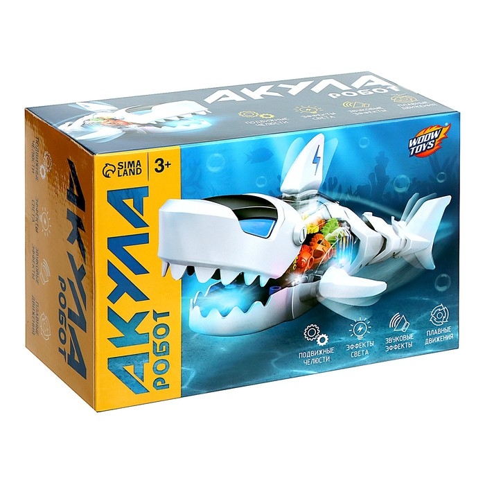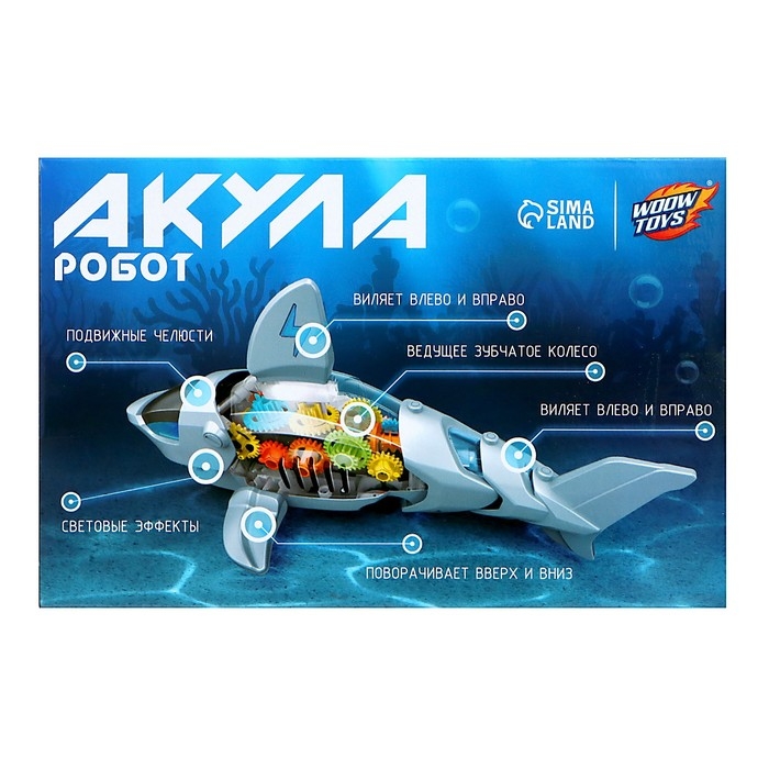 Акула «Шестерёнки» — игрушка с прозрачным корпусом. У неё внутри есть подсветка и движущиеся элементы! Акула объезжает встречающиеся препятствия и воспроизводит забавные звуки и мелодию.