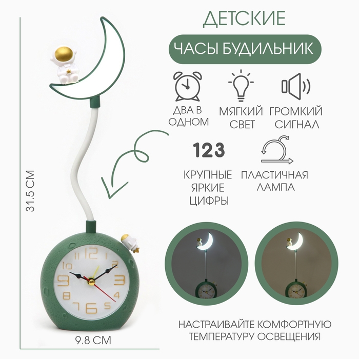 Часы - будильник с подсветкой "Полумесяц" детские, 2 режима, циферблат d-9 см, 9.8 х 31.5 см