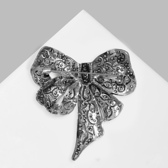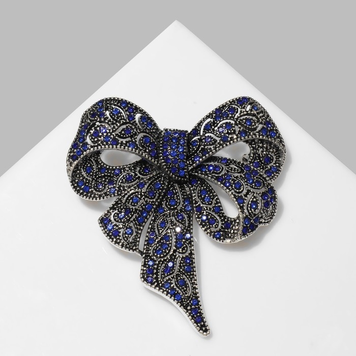 Брошь «Бант» узорчатый, цвет бело-синий в чернёном серебре